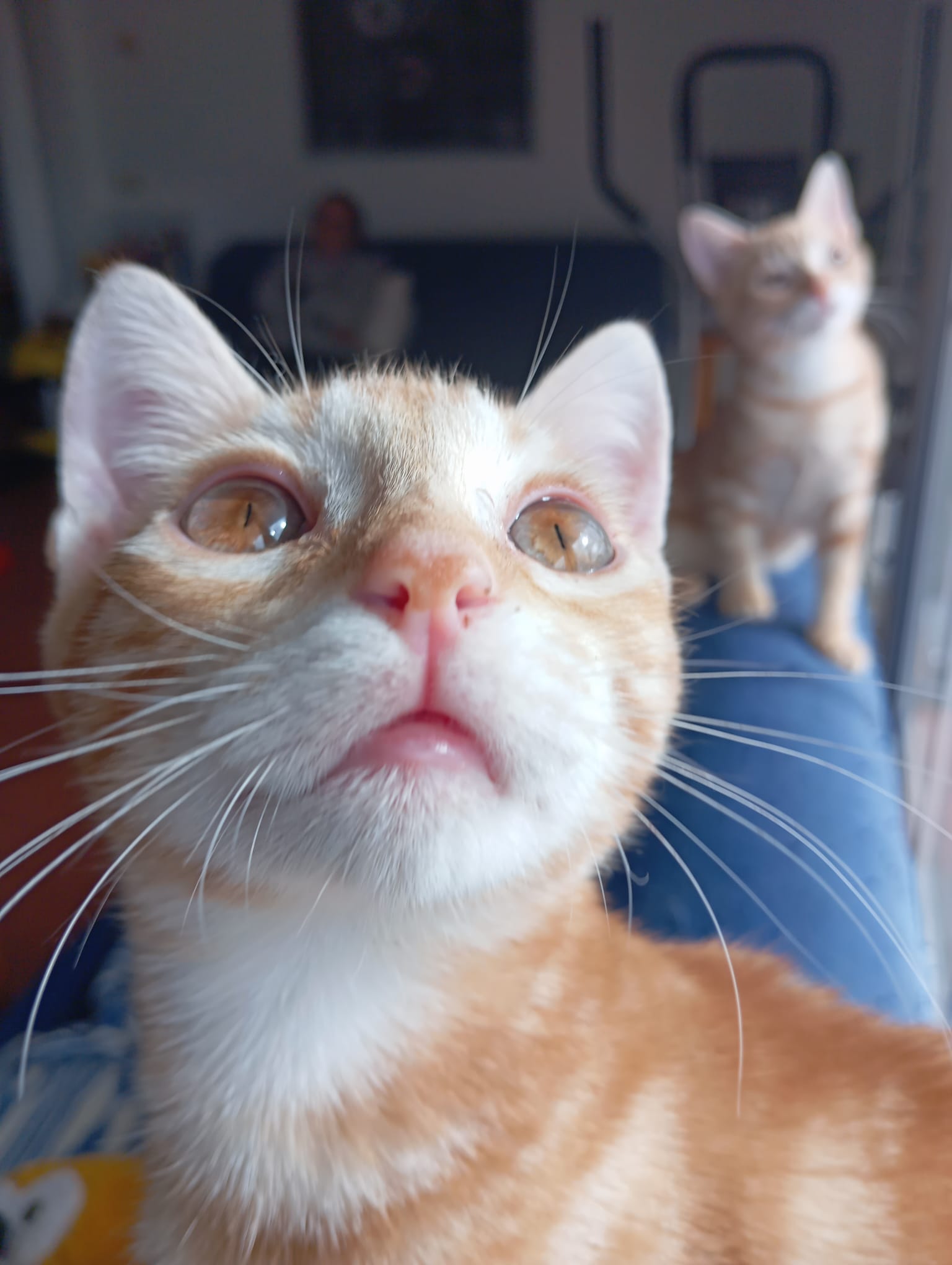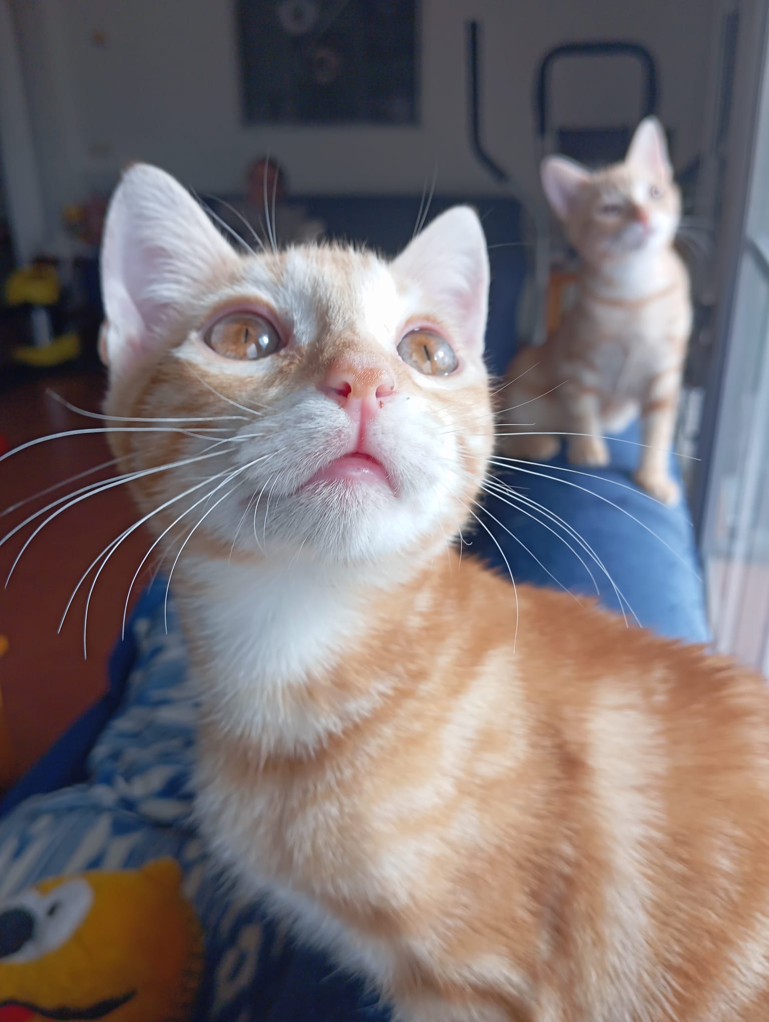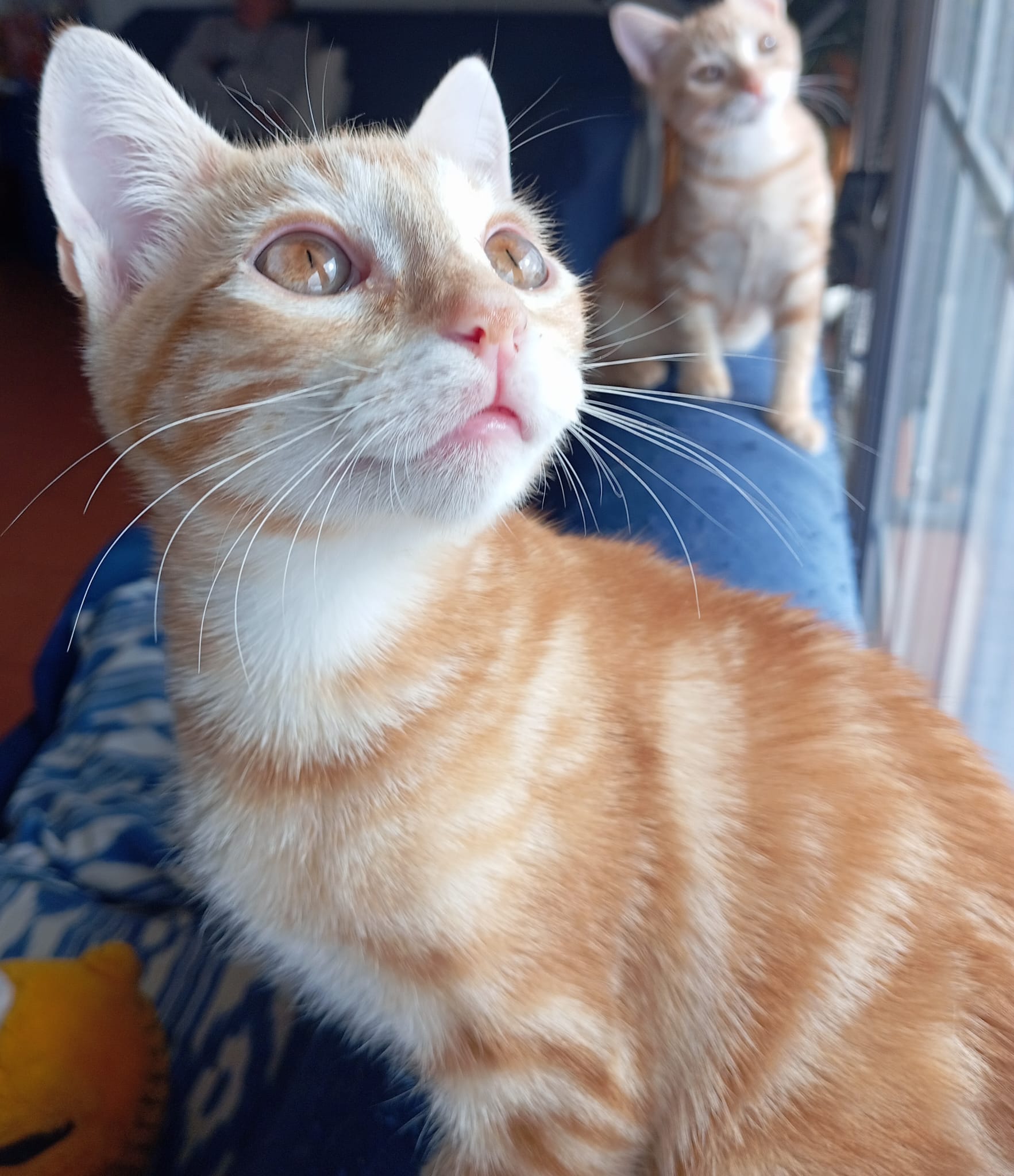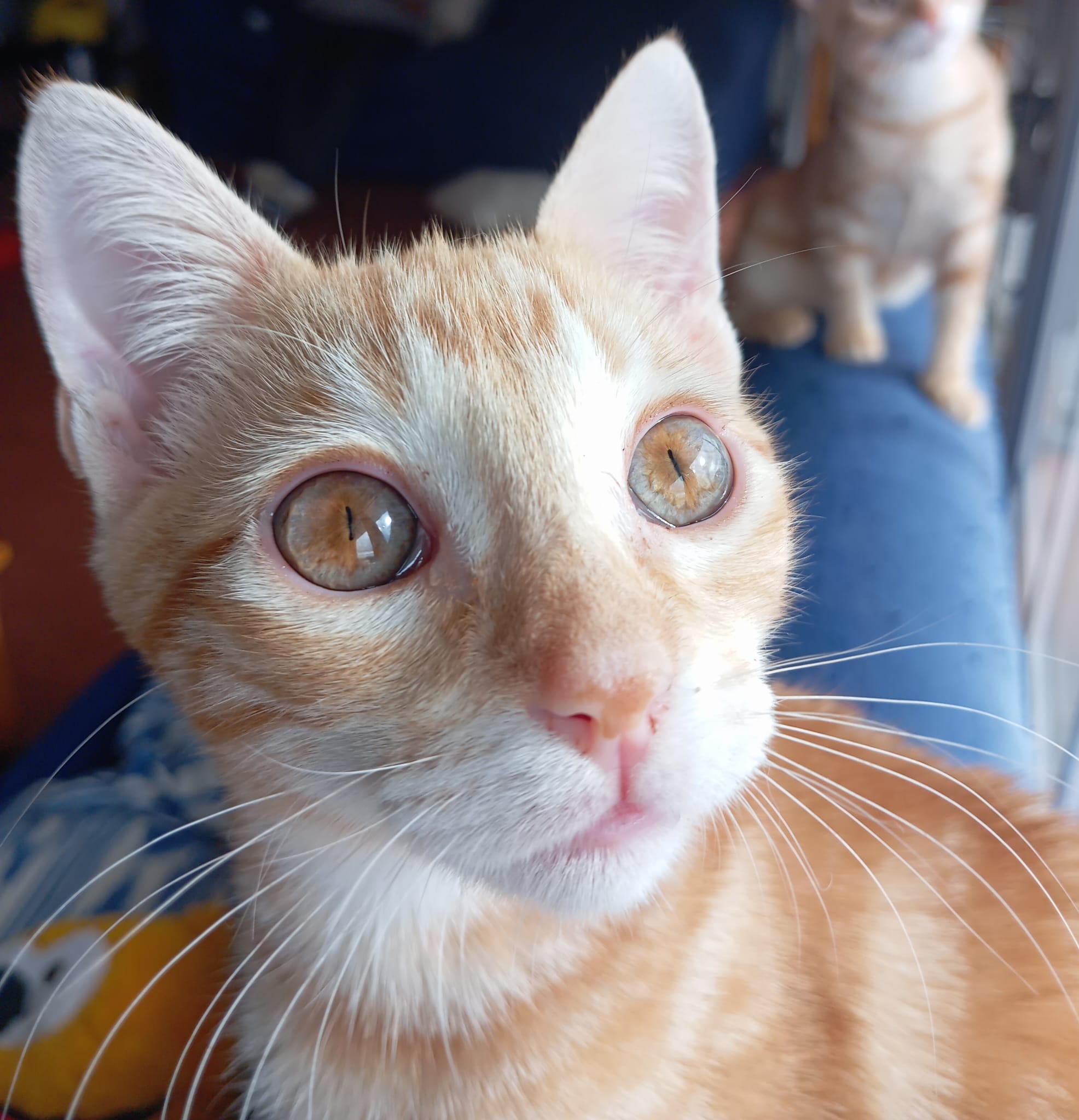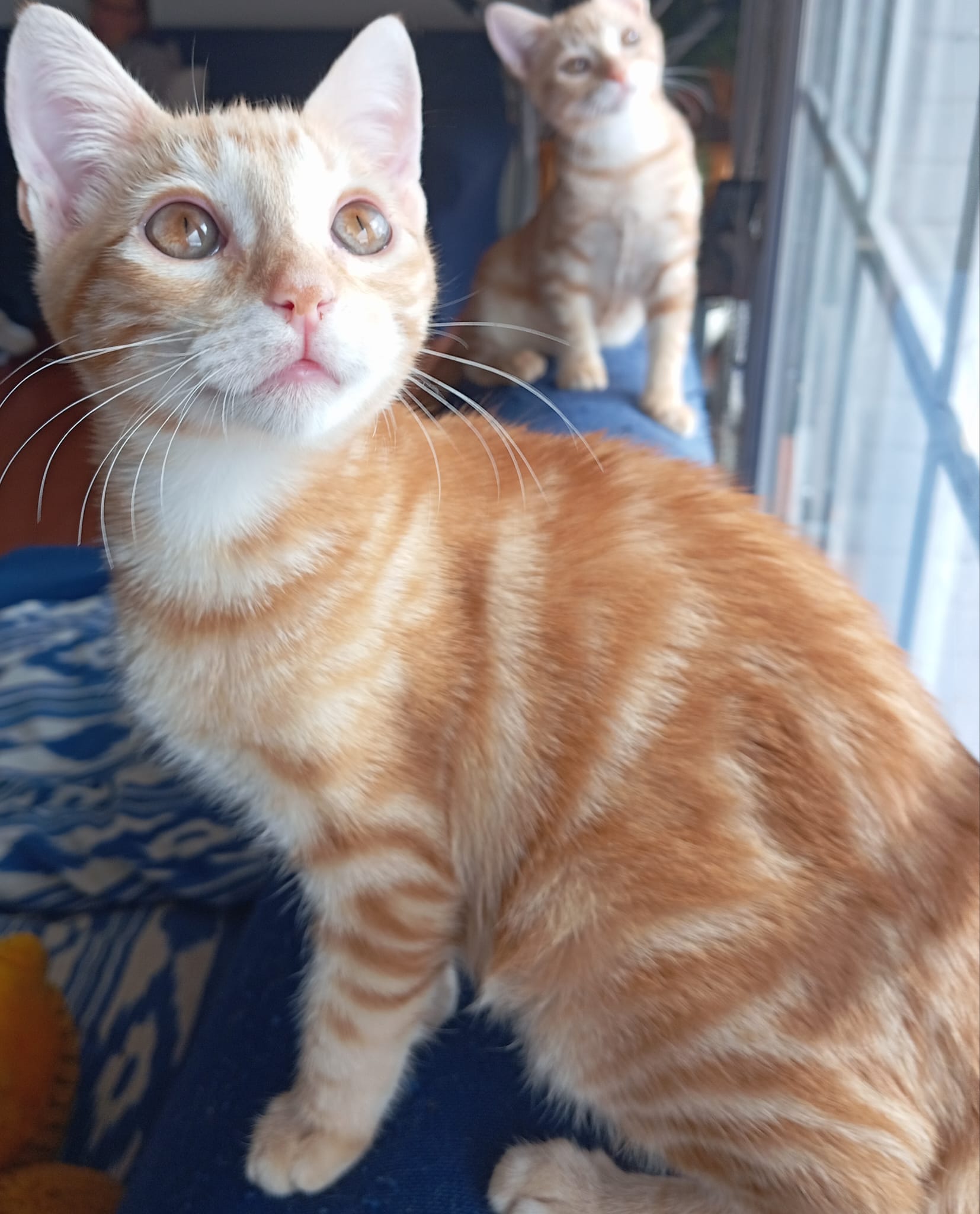 Precioso cachorro a rayas naranjas y blancas, super simpático y juguetón. Hará las delicias de la familia que lo adopte.