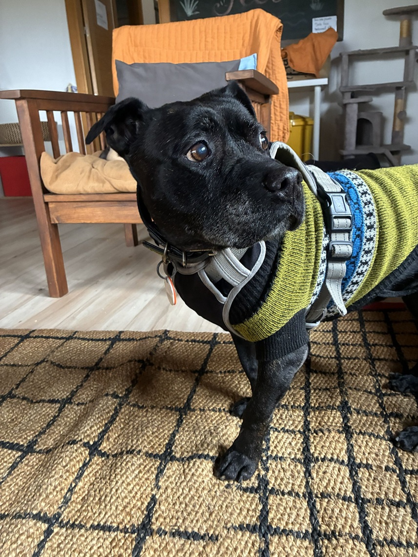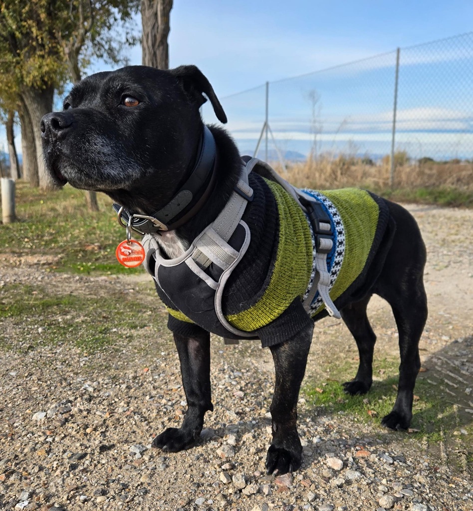 Nuka debería estar en Paraguay con Jose, su familia desde hace 12 años. Jose se traslada por causa de fuerza mayor y tenía todo arreglado, pasaporte de Nuka, transporting, etc. y en la última semana la aerolínea le dice que Nuka no puede volar, que es braquicéfala, y que esos perros no pueden ir en bodega por riesgos de salud. Nuka no tiene el hocico chato pero es mix de una de las razas que han metido en el saco, es una mini staffi. Jose ha movido cielo y tierra, hablado con mas compañías, de pasajeros, de fletes, con el Ministerio, pero solo muros e intransigencia delante. Se han separado, Nuka está en FEEL, flipando, es una abuelita adorable y super tranquila. Se entiende con personas, perros, gatos, lo que sea, ella mira y suspira. Suponemos que cavila por esta m de cambio que le ha tocado de repente. Buscamos acogida o adopción, es perra muy fácil, es abuelina de paseos tranquilos, siestas y energía que calma.