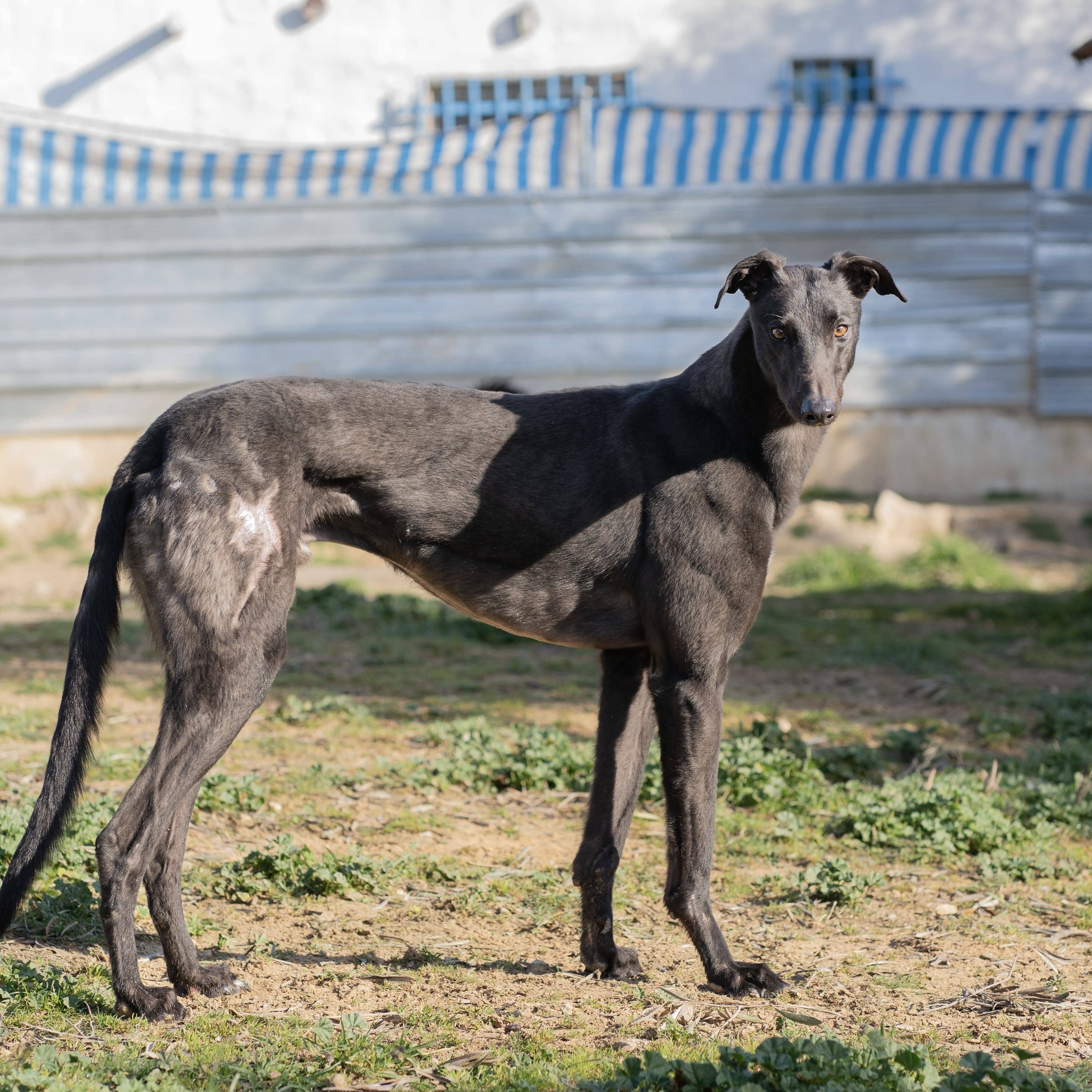 Rescatado de Ciudad Real, abandonado por un cazador. Probablemente le usaban para carreras de galgos, de ahí sus heridas en las caderas. Al hacerles correr atados detrás de vehículos se suelen caer y ser arrastrados. Tiene heridas en la piel por quemadura (arrastre).