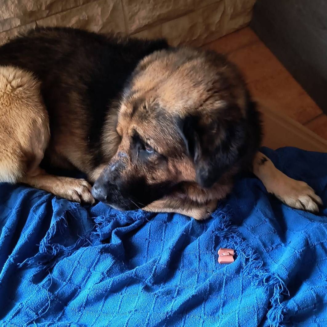 Es muy bueno y sociable aunque tímido, es cruce de pastor alemán con mastín. Es un Amor de animal, todo lo que tiene de grande lo tiene de bueno, se lleva bien con Gatos, tiene una necesidad de cariño enorme, nos angustia pensar que pase el resto de sus días en una jaula, ya lleva dos años aquí, se merece una oportunidad.