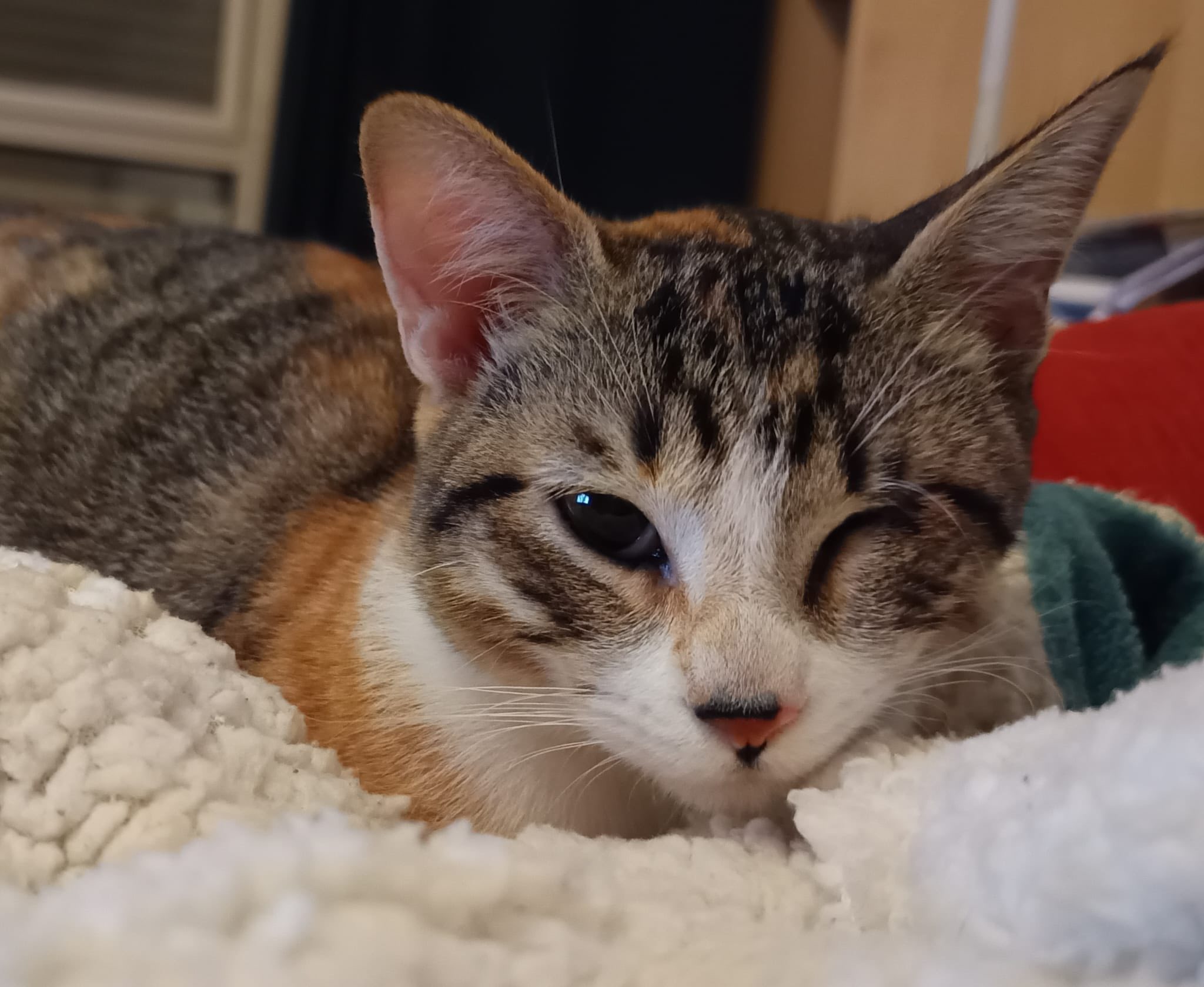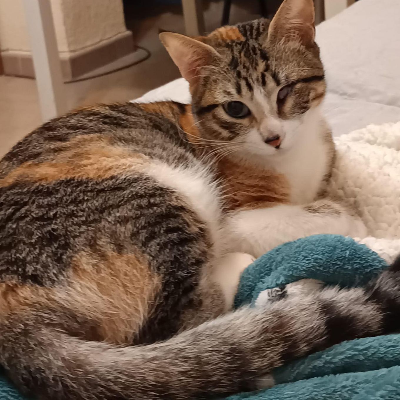 Rescatada de la calle de bebé, con una fuerte infección en los ojitos, perdió la visión en uno pero es una gatica feliz que hace vida perfectamente normal.