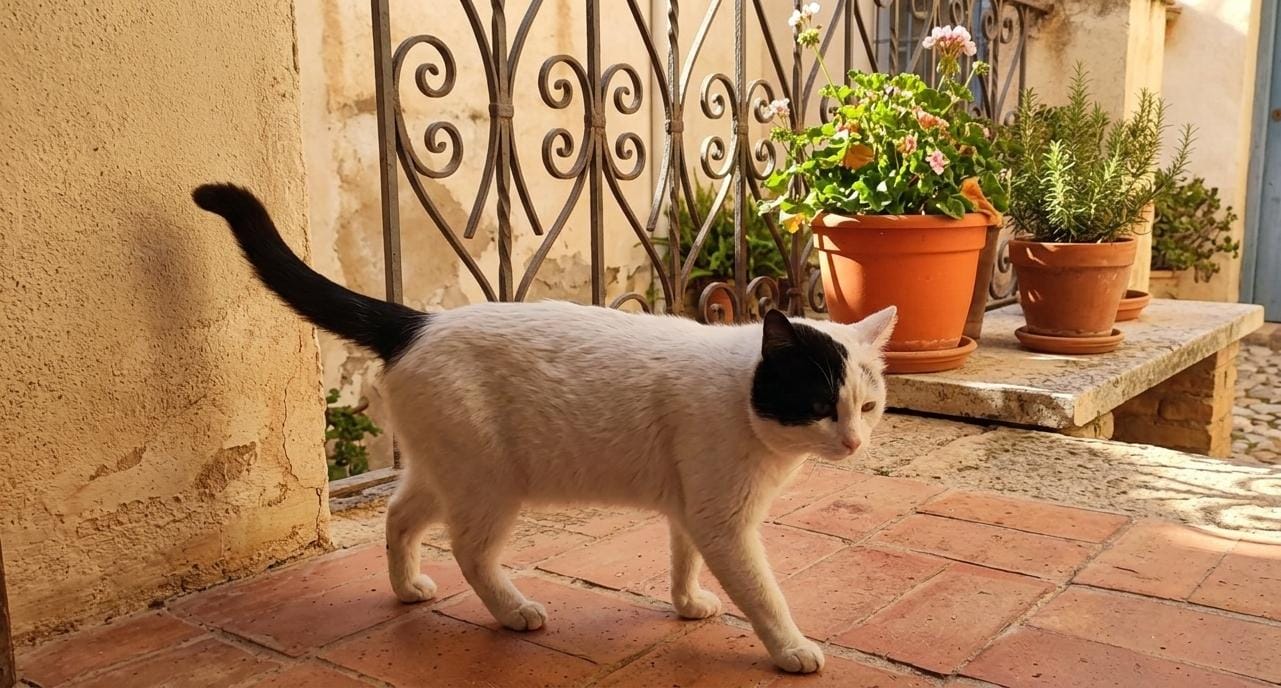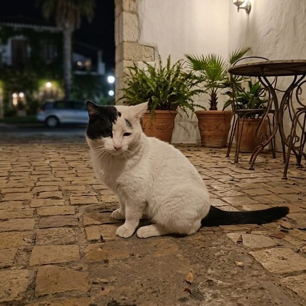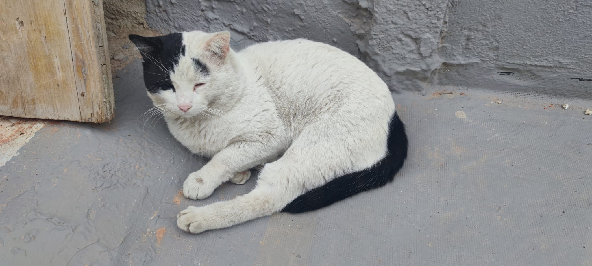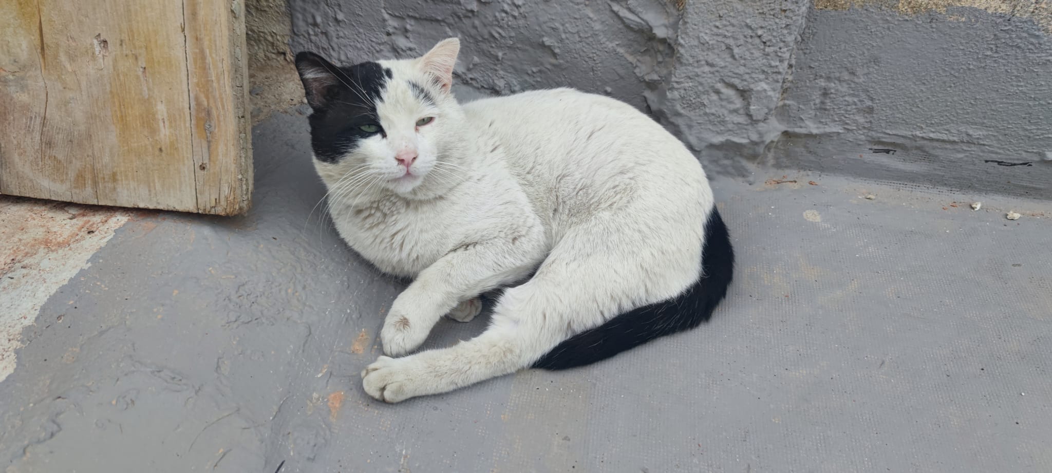 Le hemos puesto arlequín, porque se cara recuerda al maquillaje del payaso. Es un gato muy cariñoso, está en la calle, pero eso no impide que cada vez que ve una persona le dedique una volteretas