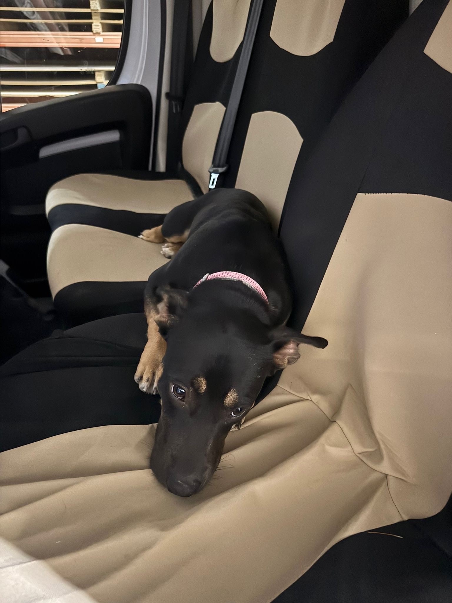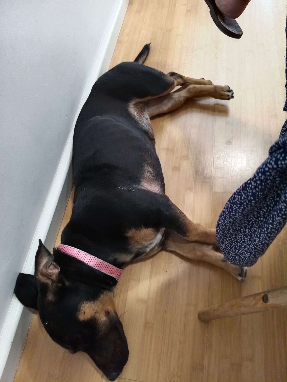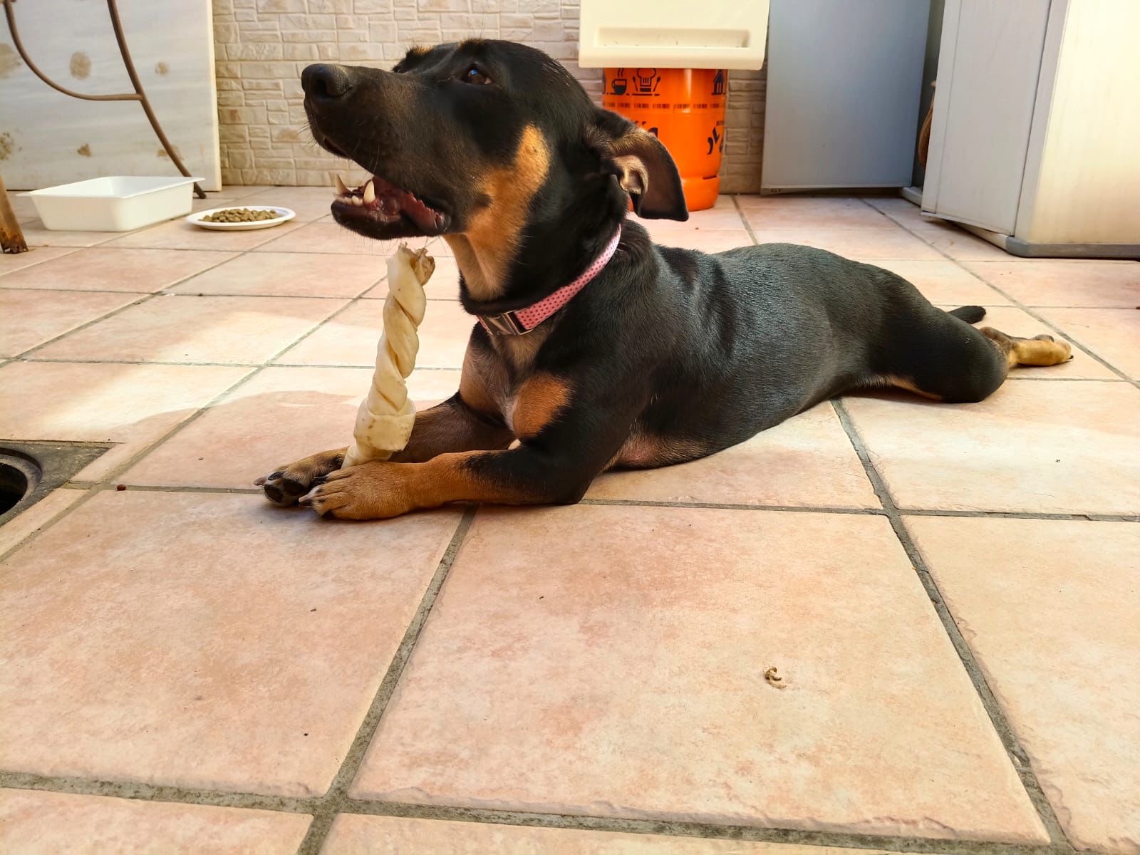 Fue maltratada por su dueño anterior. Siempre en un patio, solo se alimentaba de la comida que robaban en colonias de gatos. Nunca la sacaban a pasear.