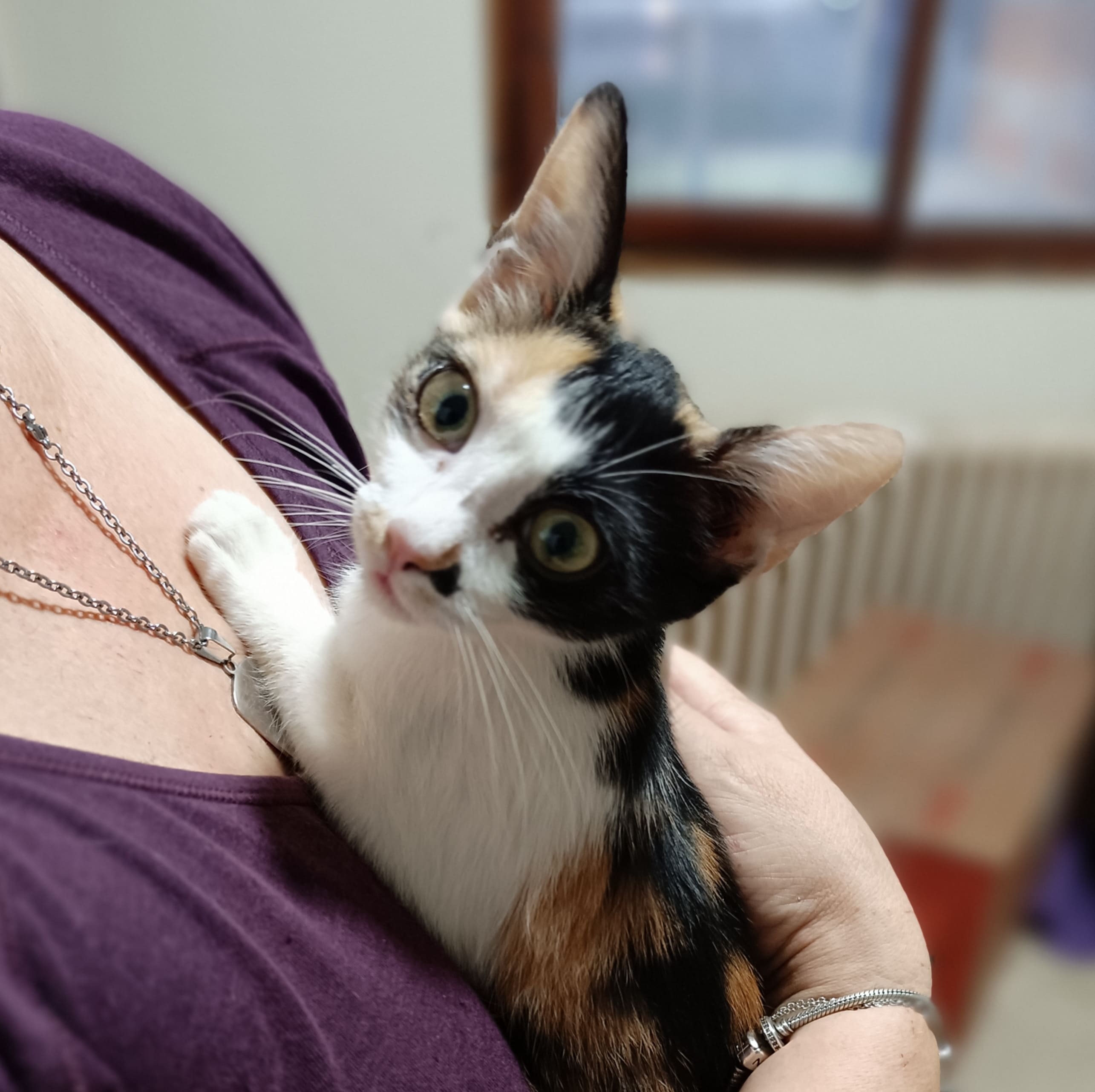 Vega es una gatita joven, de 3 meses la cual ya sabe lo duro que es vivir en la calle. Se metió en una furgoneta buscando refugio del calor, muerta de hambre y sed, sucia, desaliñada y asustada. La trajimos al refugio, y aunque tiene miedo y al principio bufa, al día siguiente ya cuando la cogíamos empezaba a ronronear. Ya está desparasitada ,con las dos dosis de la vacuna trivalente, con microchip y pasaporte y test negativo a leucemia e inmunodeficiencia felina, lista para encontrar un hogar, y que vivir en la calle solo sea un mal recuerdo. Se lleva genial con otros gatos y es súper cariñosa con las personas