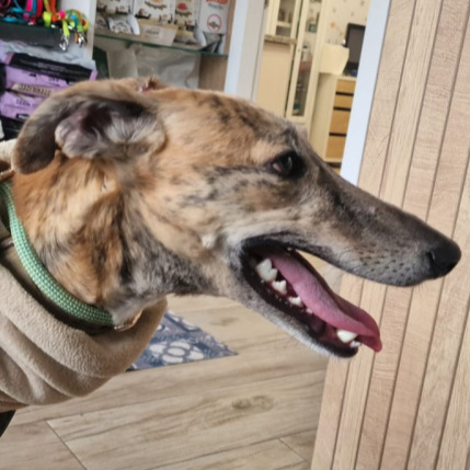 Kali es una galga juguetona, activa, simpática y con ganas de marcha, se lo pasa pipa jugando con el resto del grupo de galgos. Era compañera inseparable de Esme, ya adoptada, por lo que ahora le toca a ella. Ideal para una persona que quiera disfrutar de una galga sin miedos correteando con esas patas locas de acá para allá.