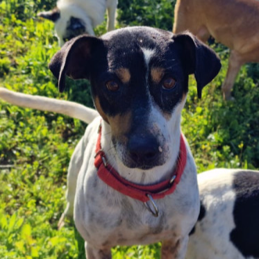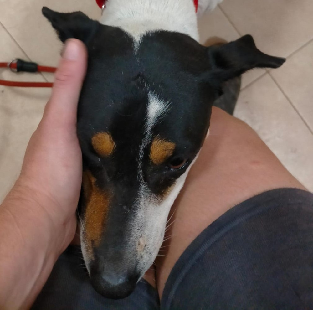 Lo encontramos abandonado en un polígono, no se separaba del sitio donde le dejaron con el coche, como nos confirmó un vecino. Quiere más que nada en el mundo estar pegado a los humanos, es claramente un abandono de familia. Buscamos para él una casa donde sea feliz dando todo el amor que lleva dentro. Ya lleva mucho tiempo con nosotras y nadie ha preguntado por él, tristemente.
