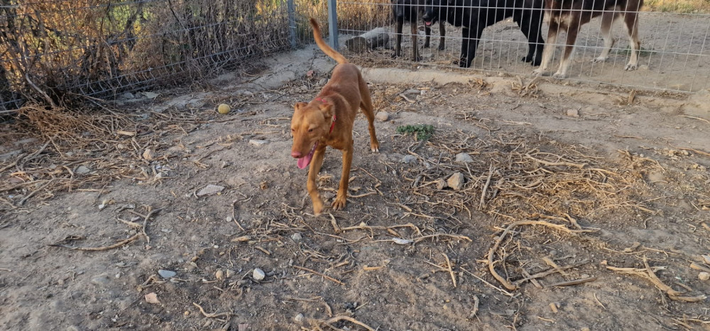 Red es un podenco jovencito que llevaba unos 4 meses abandonado cerca del refugio. Se juntaba con una mastina de una finca cercana, salía a la carretera pero era imposible tan siquiera acercarse a él a muchos metros. Una noche, un voluntario volviendo al refugio lo vio en la carretera, como tantas otras veces, pero por la razón que fuera Red decidió que ya estaba bien de vivir en la calle, y se dejó coger.
