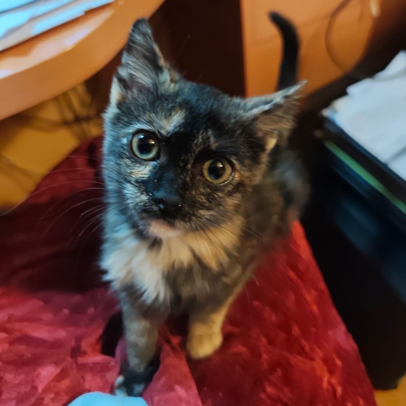 Rescatada del motor de un coche. Ahora necesitan un hogar.
