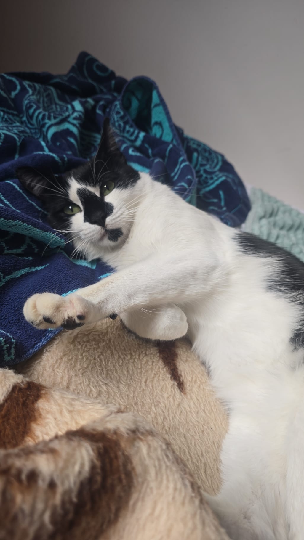 Gato macho de un año aproximadamente, blanco y negro muy bueno y cariñoso. Positivo en leucemia.