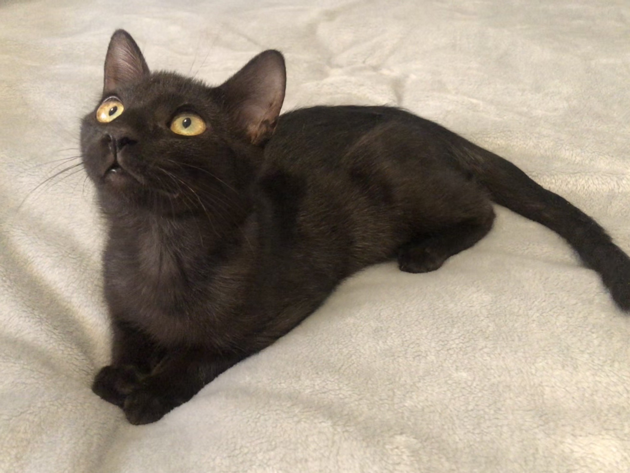 Gatito negro brillante, como una pequeña panterita. Joven, juguetón, muy sociable y cariñoso.