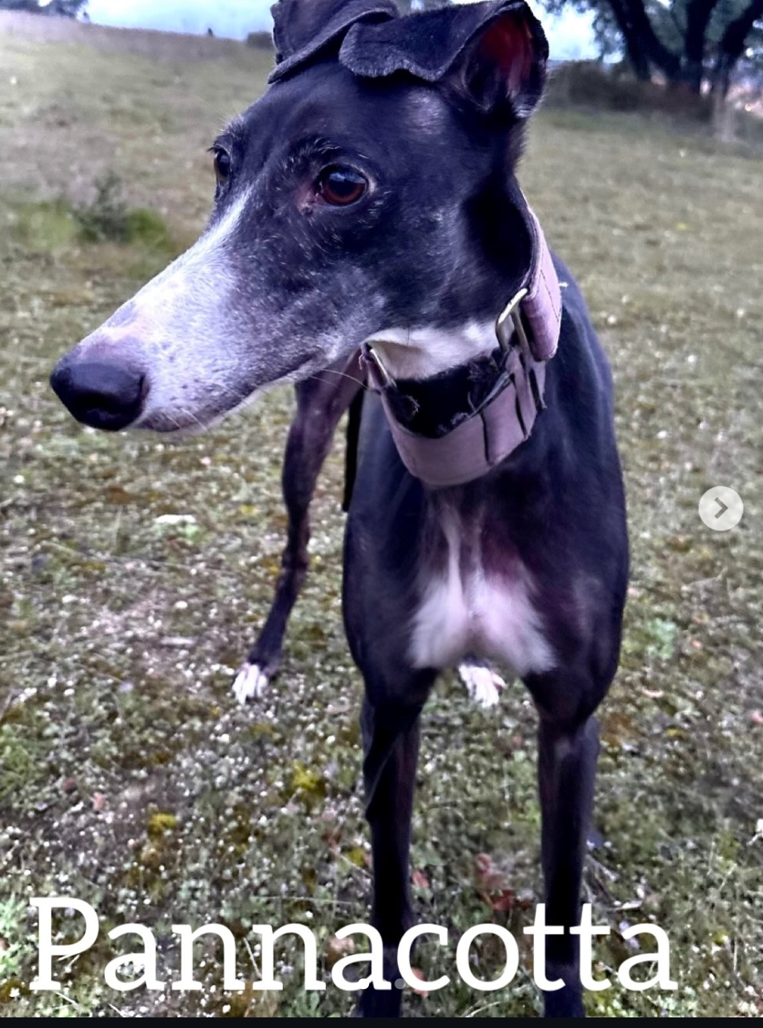 Pannacotta es una galga dulce, tranquila y muy sensible que busca un hogar donde sentirse segura y querida. En casa es una compañera perfecta: pasa gran parte del día descansando en su camita, es muy respetuosa con las normas y tiene un carácter calmado y equilibrado. No se sube a los sillones, no entra en la cocina y entiende perfectamente órdenes básicas como sit o ir a su cama cuando se lo piden. En los paseos también es una perrita tranquila y sociable con las personas. Con perros pequeños suele animarse a jugar, aunque con los perros grandes que no conoce se muestra algo tímida al principio. Como buena galga, tiene instinto de rastreo, por lo que disfruta mucho explorando olores durante el paseo. Con la comida es muy educada y calmada: come despacio, sin ansiedad, y confía plenamente en que nadie le va a quitar su plato. Es una perrita muy noble y paciente, que incluso se aparta si le pides que pare de comer para retirar el plato. Pannacotta es una perra sensible que al principio puede mostrarse algo insegura, por lo que necesita una familia paciente que le dé tiempo para adaptarse. Cuando coge confianza demuestra lo cariñosa que es y lo mucho que disfruta de la compañía humana. Le encantan las caricias… ¡a veces incluso prefiere mimos antes que terminar de comer! Está acostumbrada a descansar en su jaula, que para ella es su refugio y su lugar seguro cuando se queda sola en casa. Gracias a esto se relaja y espera tranquila a que vuelvan sus humanos. Pannacotta busca una familia tranquila, que entienda su sensibilidad y le ofrezca un hogar estable donde seguir descubriendo lo bonita que puede ser la vida. A cambio, regalará calma, ternura y esa mirada dulce que solo tienen los galgos.