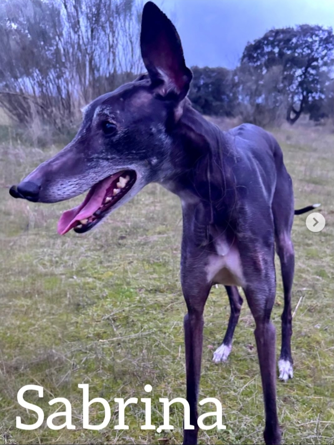 Sabrina es una galga tranquila, cariñosa y muy juguetona, con alma de cachorro eterno. En casa es muy fácil de llevar: le encanta comer, dormir en su cama mullida y disfrutar de sus paseos. Es muy obediente, entiende órdenes básicas y responde perfectamente a su nombre. En la calle es alegre y le encanta correr y jugar, especialmente con palos. Camina muy bien con correa y se lleva bien con otros perros, aunque al principio puede mostrarse un poco prudente. No tiene miedos a ruidos como tormentas, coches o fuegos artificiales. Es una perra muy equilibrada: puede quedarse sola en casa sin problema, es tranquila durante la noche y viaja bien en coche. También se porta fenomenal en el veterinario. Eso sí, es muy friolera (necesita abrigo en invierno) y bastante glotona, como buena galga. Sabrina es una compañera maravillosa: divertida, noble y fácil de convivir. Solo necesita una familia que le dé el hogar definitivo que merece.