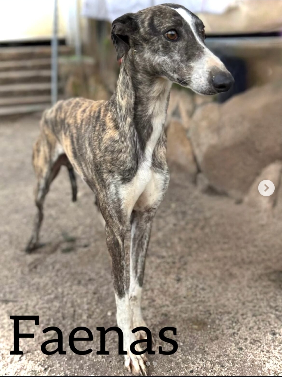 Faenas es un precioso galgo que conquista a cualquiera que lo conozca. A primera vista puede parecer un poco tímido, pero en realidad solo necesita unos segundos para acercarse y confiar en ti. En cuanto te conoce, muestra su verdadero carácter: es un perro muy bueno, dulce y cariñoso. Le encanta estar con las personas y se deja manipular muy bien, lo que demuestra lo noble y tranquilo que es. Es de esos galgos que enseguida conectan contigo y disfrutan de la compañía y los mimos. Convive perfectamente con otros perros y además tiene un lado muy divertido: es un perrito con bastante energía que disfruta mucho jugando y corriendo con sus compañeros. Verlo jugar es pura alegría. Faenas tiene todo para ser un compañero maravilloso: cariño, nobleza y ganas de compartir momentos con su familia. Ahora solo le falta lo más importante: un hogar donde lo quieran para siempre. Si buscas un compañero fiel, dulce y lleno de vida, Faenas puede ser el galgo que estabas esperando.