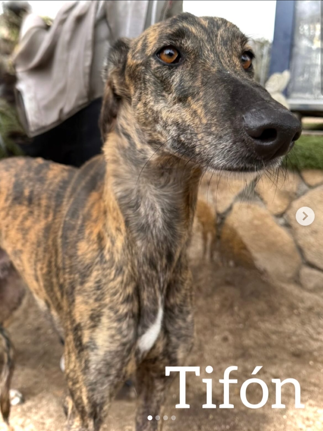 Tifón es un galgo precioso con un carácter que enamora desde el primer momento. Es un perro muy alegre y extremadamente cariñoso con las personas; le encanta recibir mimos y estar cerca de quienes le rodean. Su dulzura y cercanía hacen que sea el compañero perfecto para cualquier familia. Con otros perros, Tifón se comporta de manera ejemplar: es sociable, equilibrado y sabe relacionarse muy bien, por lo que puede convivir sin problema con otros peludos. Además, camina perfectamente con la correa, disfrutando de los paseos tranquilos y mostrando lo bien educado que es. Tifón solo necesita una oportunidad para demostrar todo el amor que tiene para dar. Si buscas un compañero fiel, cariñoso y noble, Tifón es el galgo que estás esperando.