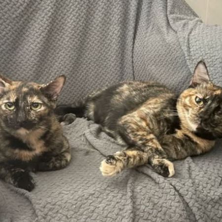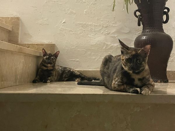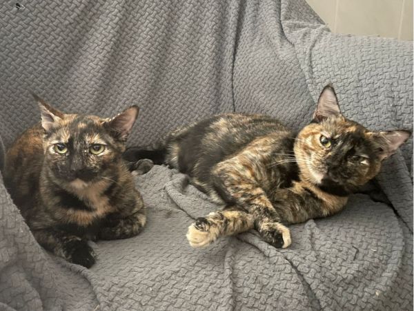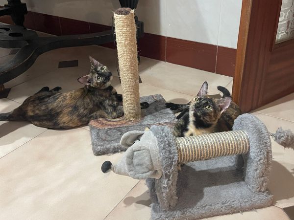 Barbie y Cati son dos hermanas carey que forman un dúo inseparable. Se quieren y se comprenden tanto que solo se pueden adoptar juntas; sería cruel separarlas. Su fecha estimada de nacimiento es alrededor de octubre de 2023. Al principio eran tímidas y reservadas en el refugio, pero pasaron varios meses en una casa de acogida aprendiendo a interactuar con los humanos. Han hecho grandes progresos y ahora están listas para encontrar su hogar definitivo. Son tranquilas y necesitan un tiempo para adaptarse a nuevas personas y situaciones, por lo que un hogar solo de adultos o con niños mayores sería ideal. Son amigables con otros gatos y perros, ya que convivieron en acogida con dos gatos y dos perros. Una vez que se acostumbran a su familia, pueden ser muy insistentes cuando quieren algo. Les encanta jugar y relajarse juntas, son independientes y tranquilas. Barbie y Cati son muy hermosas, con marcas únicas: Barbie tiene la cara más oscura y Cati la cara de dos tonos. Están esterilizadas, han dado negativo en FIV y FeLV, vacunadas y son sanas y felices. Barbie y Cati serán las princesas de su nuevo hogar.