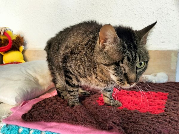 Fina es una linda gata atigrada, nacida aproximadamente en julio de 2018. Fue encontrada deambulando por las calles de Adsubia y llegó a APROP en marzo de 2023. A Fina le extirparon el ojo derecho y la esterilizaron antes de llegar a APROP, lo que indica que claramente había tenido un hogar, aunque nadie se presentó a reclamarla. Es muy amigable con los humanos, le encanta abrazarse y recibir caricias. Tiene un carácter cariñoso y tranquilo, y es la gata faldera perfecta. Se adaptaría mejor a un hogar con adultos o niños mayores. Se lleva bien con otros gatos amistosos, aunque no ha sido probada con perros. Fina ha dado negativo en las pruebas de FIV y FeLV, está sana y feliz, y está esperando a la familia adecuada que le brinde un hogar lleno de amor.