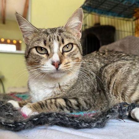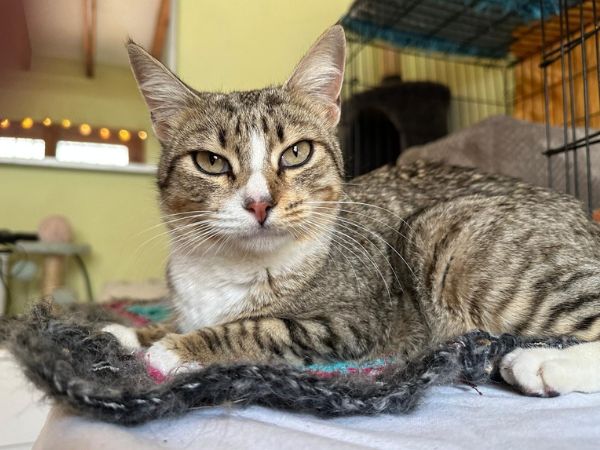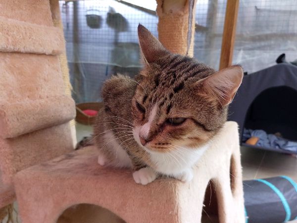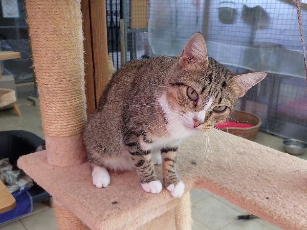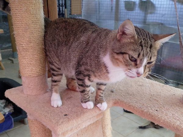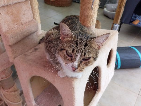 Kleo es una preciosa gata atigrada y blanca, nacida aproximadamente en enero de 2022. Es muy amigable, habladora y siempre atenta a lo que pasa a su alrededor. Le encanta “contarte” cómo le ha ido el día y disfruta de la compañía humana. Es tranquila, sociable con otros gatos y muy dulce en su trato. Está esterilizada, tiene microchip, sus vacunas al día y se encuentra completamente sana. Es una gata cariñosa que está lista para encontrar un hogar definitivo donde pueda recibir todo el amor que merece