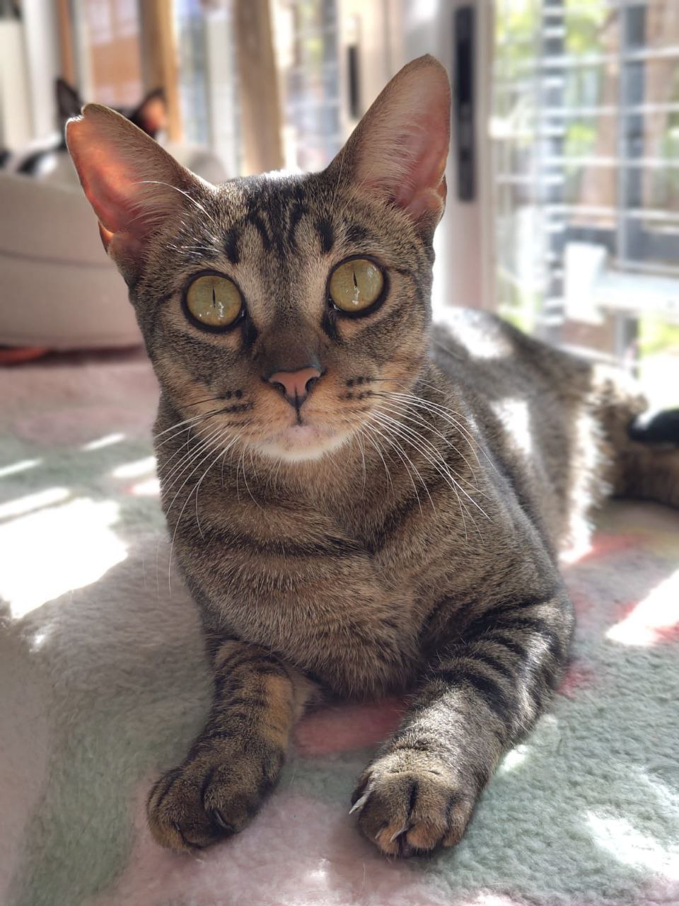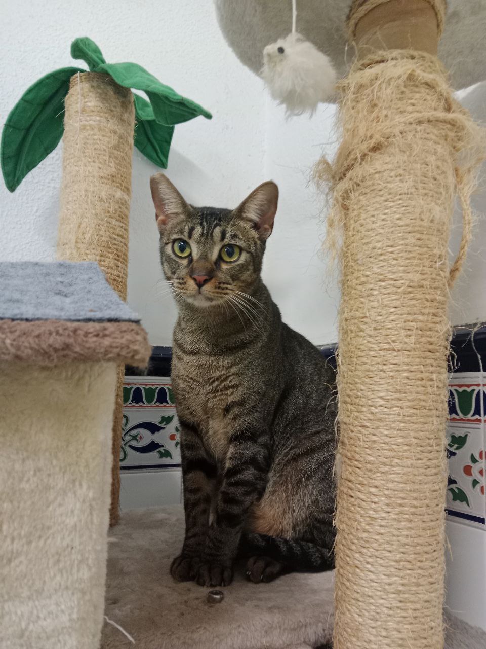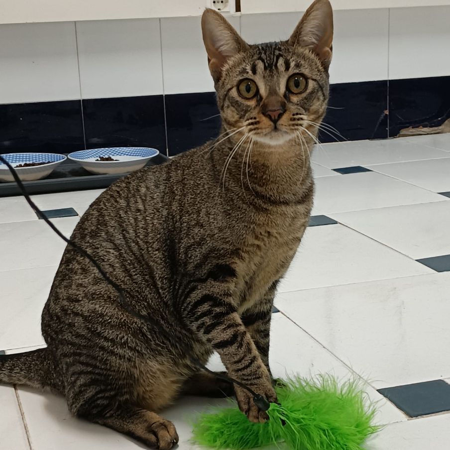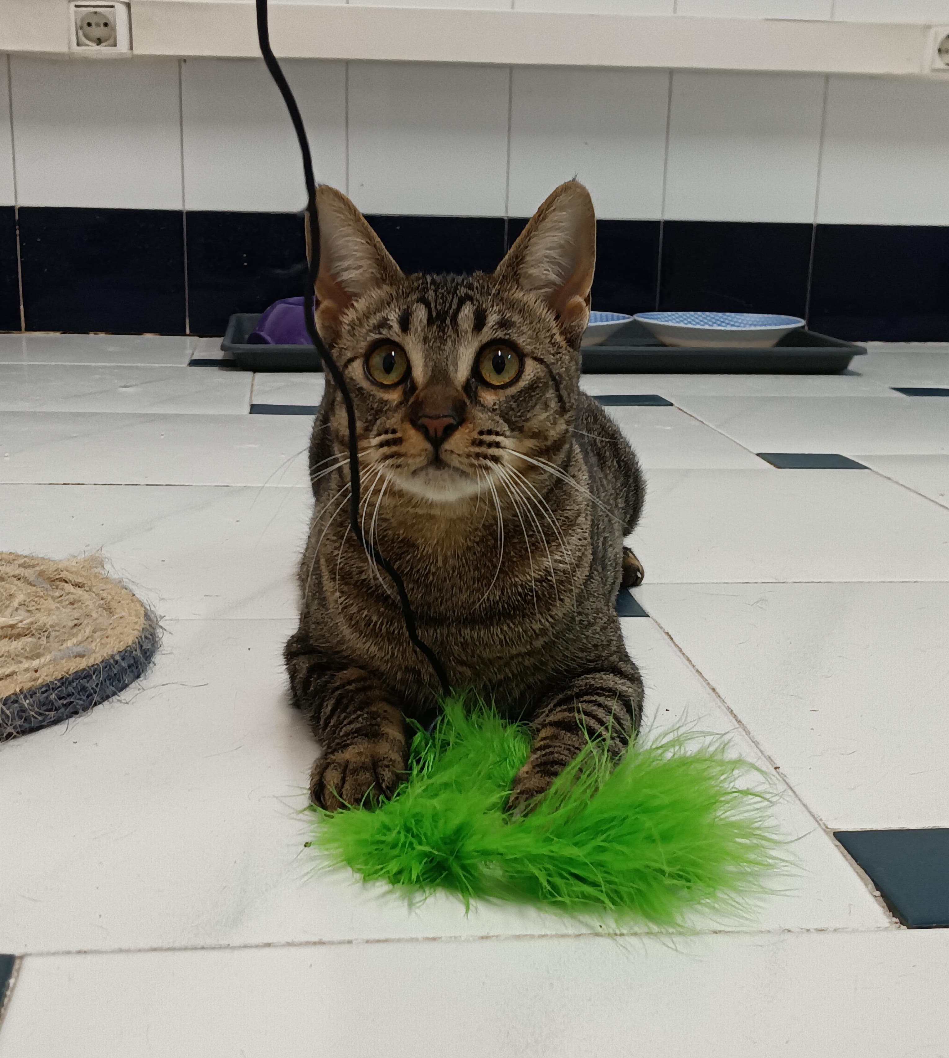 Liebre apareció una noche sola, debajo de los coches. Estaba muerta de hambre y con mucho miedo. Algo tímida al principio, juguetona y cariñosa. Testada negativo.