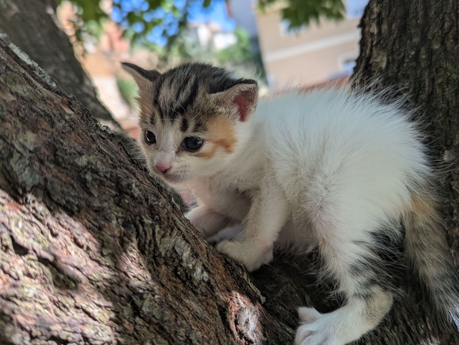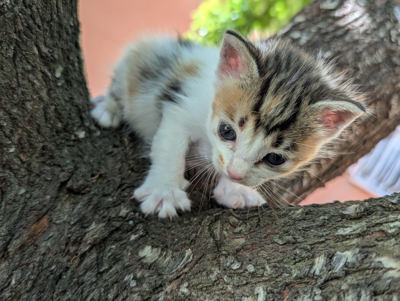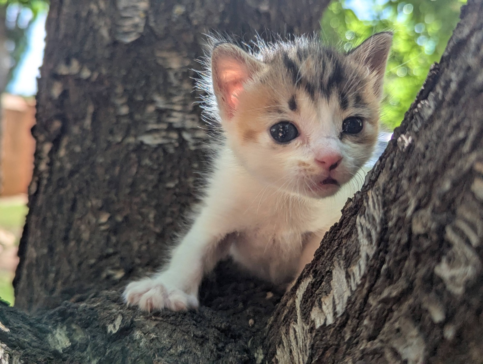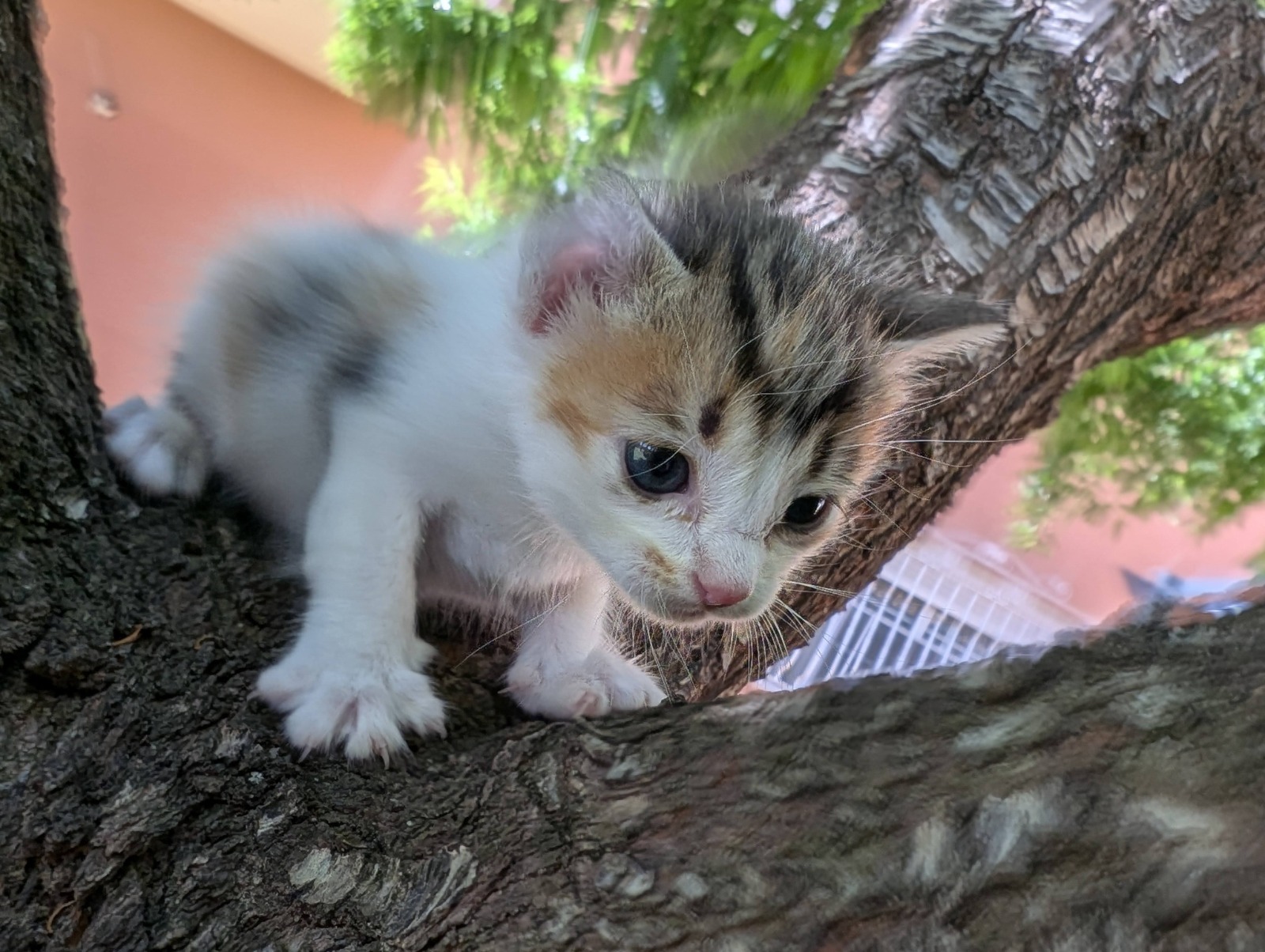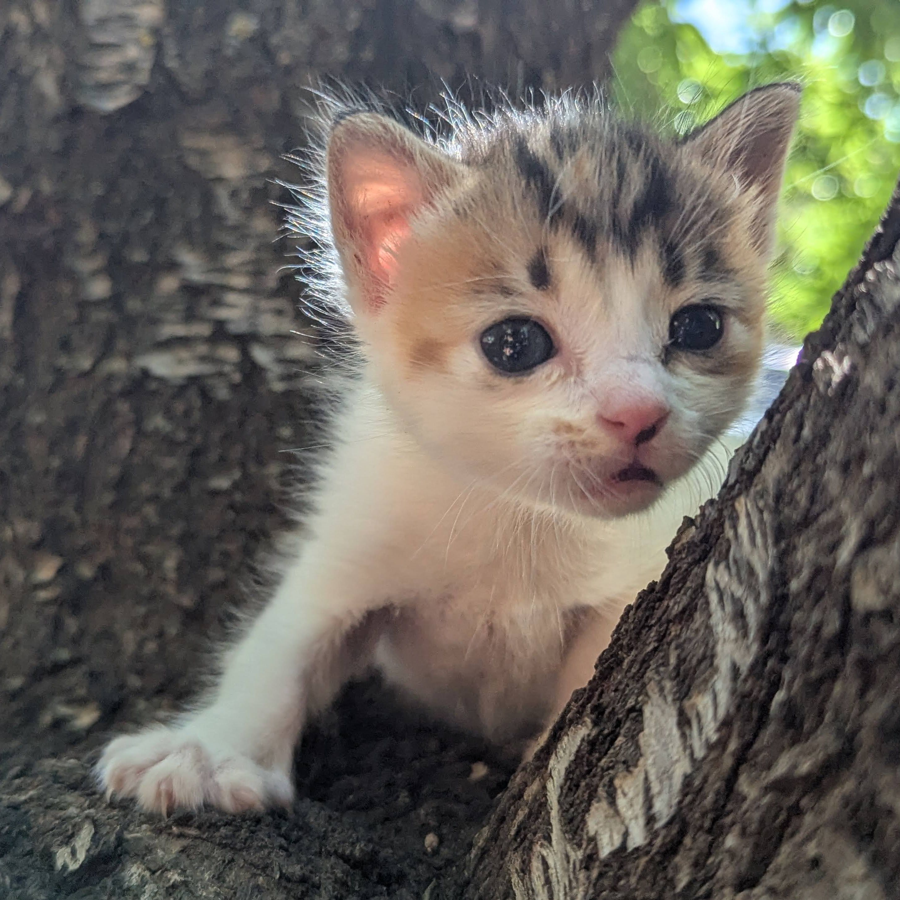 Mele es una adorable gatita tricolor, blanca con manchitas naranjas y pardas. Tiene apenas 1 mes y es muy buena, cariñosa y curiosa. Le encanta jugar con su hermano y después quedarse dormida encima de las personas. Es una pequeñita muy especial y dulce.
