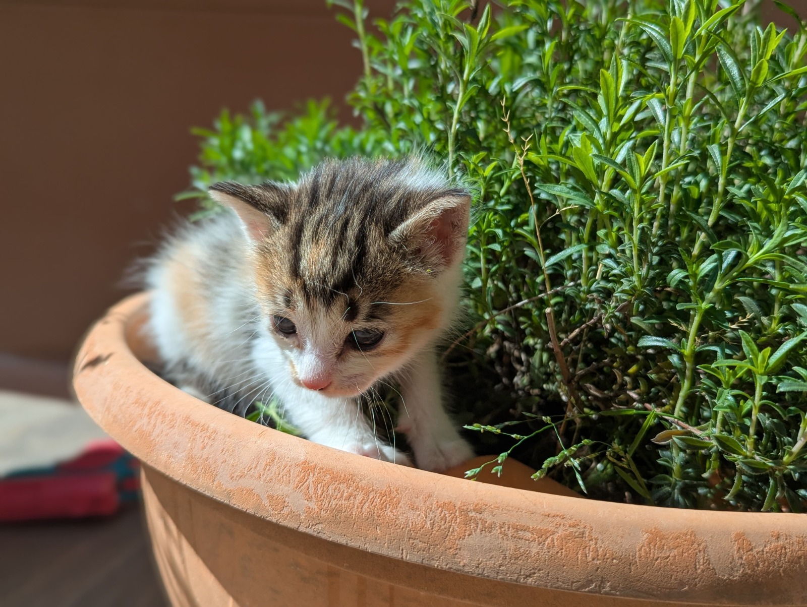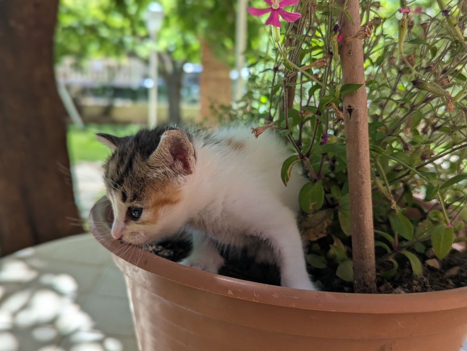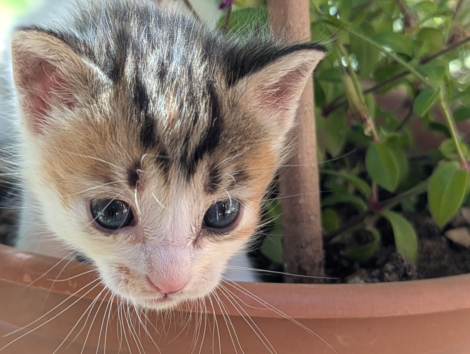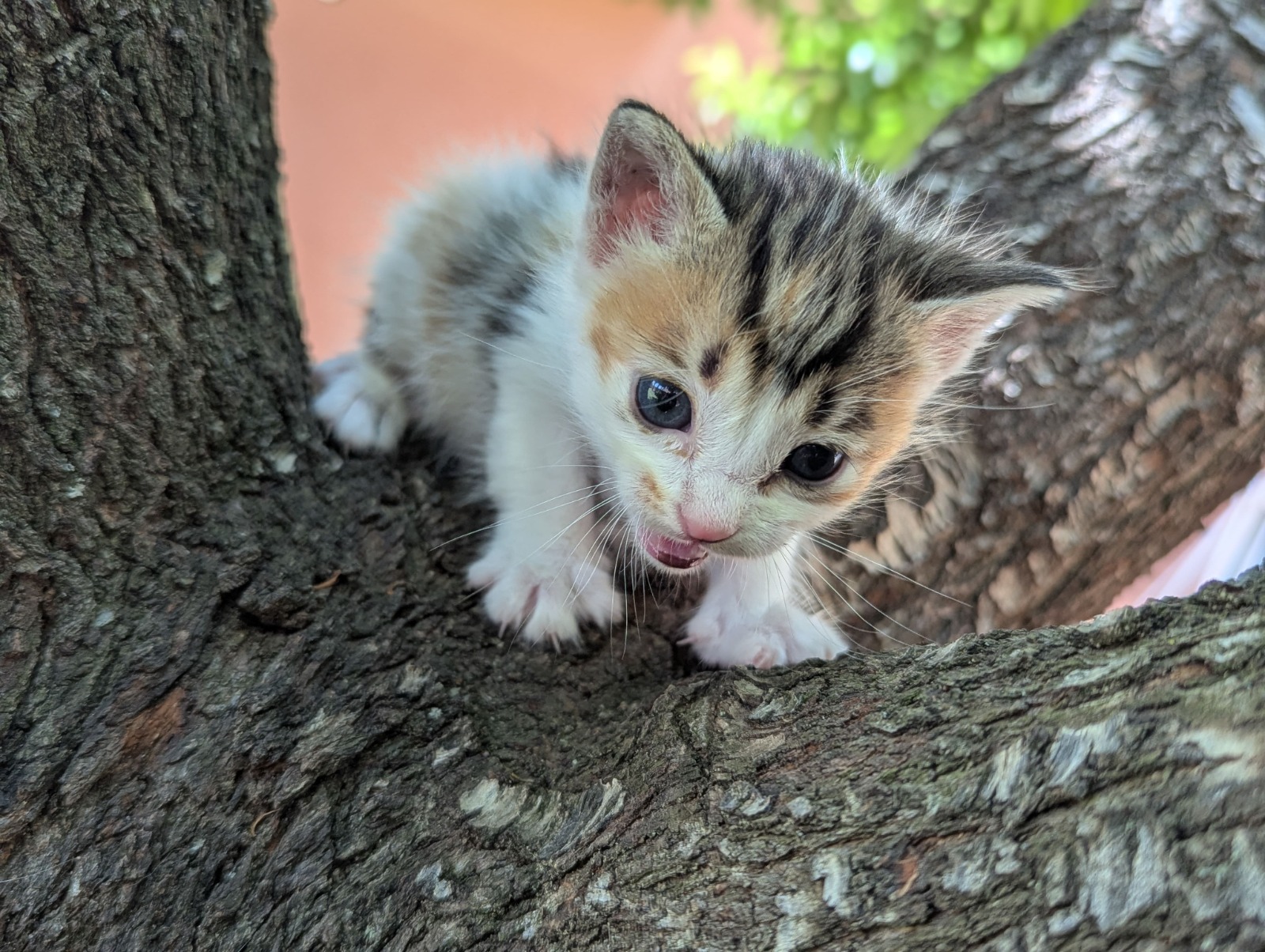 Mele es una adorable gatita tricolor, blanca con manchitas naranjas y pardas. Tiene apenas 1 mes y es muy buena, cariñosa y curiosa. Le encanta jugar con su hermano y después quedarse dormida encima de las personas. Es una pequeñita muy especial y dulce.