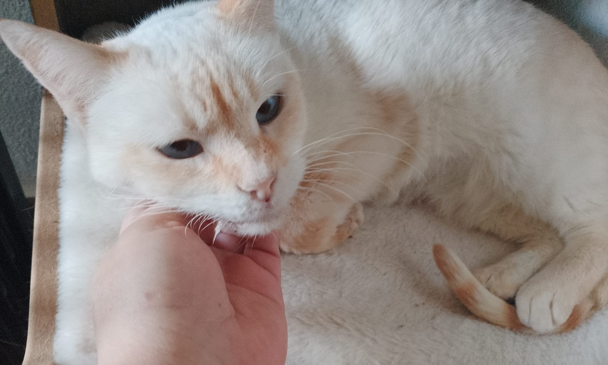 A Sante la rescatamos cuando la abandonaron estando muy malita de la boca. Pese a encontrarse mal no perdió la fe en las personas: perseguía a la gente por la calle buscando una caricia, un poco de cariño, alguien que no la ignorara. Cuando la rescatamos y fue al veterinario, nos confirmaron que tenían que operarla y quitarle muchas piezas dentales. Se ha portado siempre de maravilla, sin un mal gesto ni una queja, dejándose cuidar.
