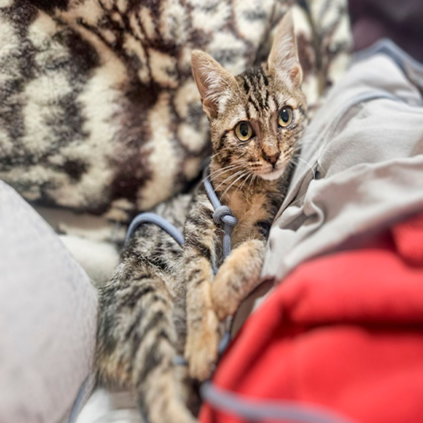 Trixie es una preciosa gatita parda tabby de 3 meses, muy buena, sociable y juguetona. Adora los mimos, se lleva bien con todo el mundo y siempre está buscando compañía. Es dulce, curiosa y llena de energía.