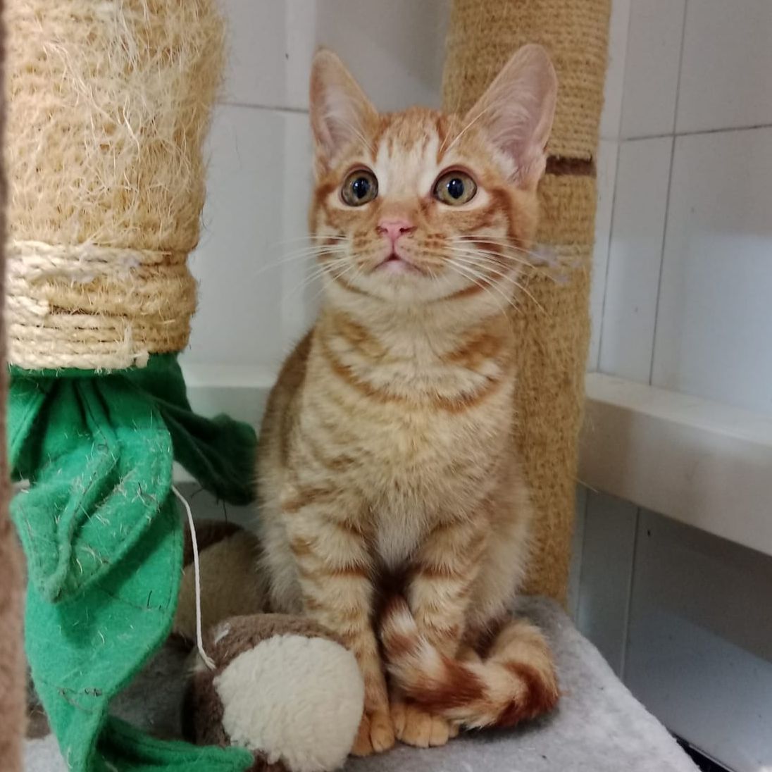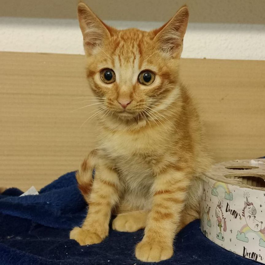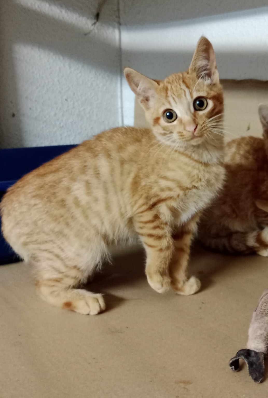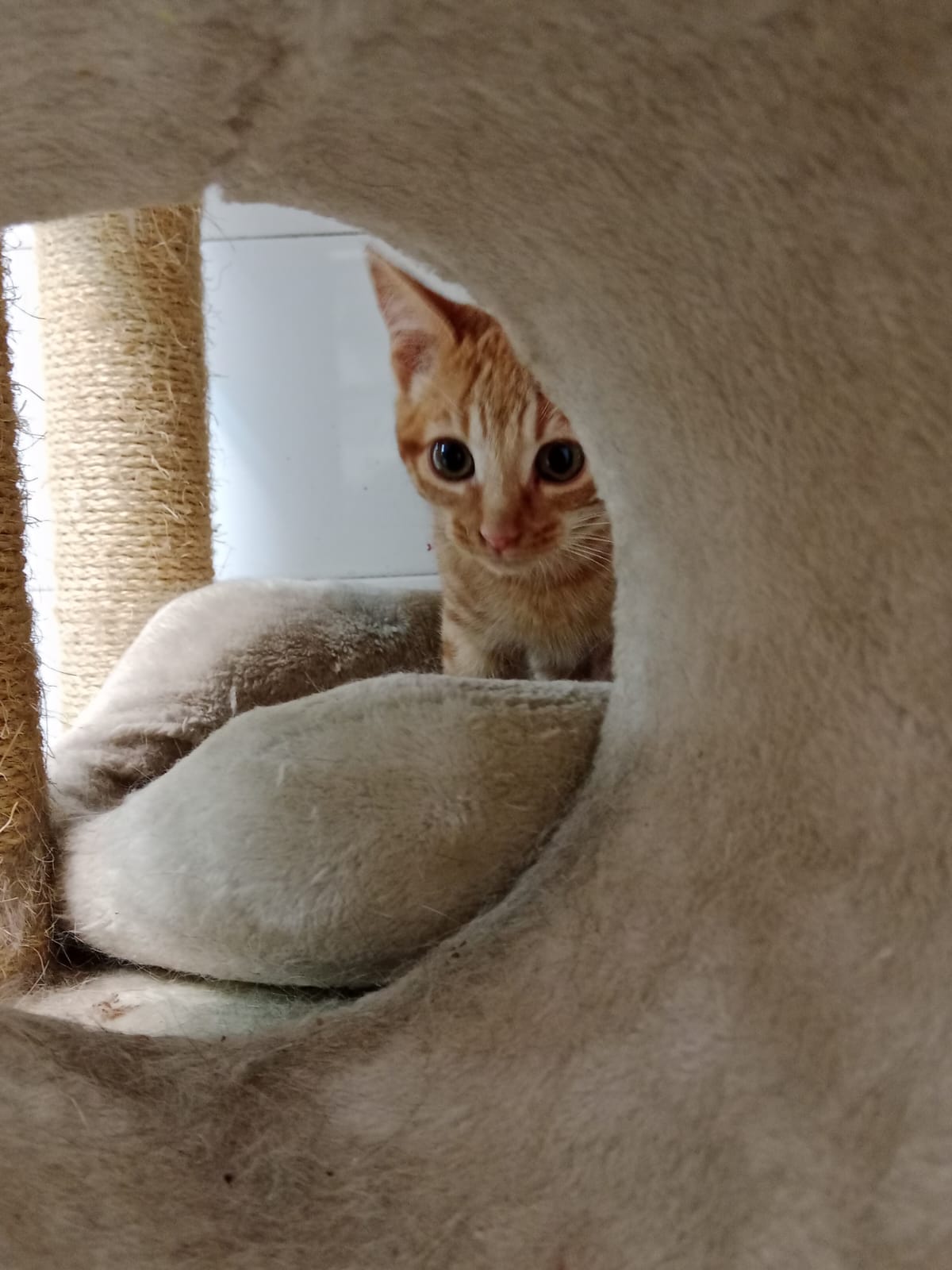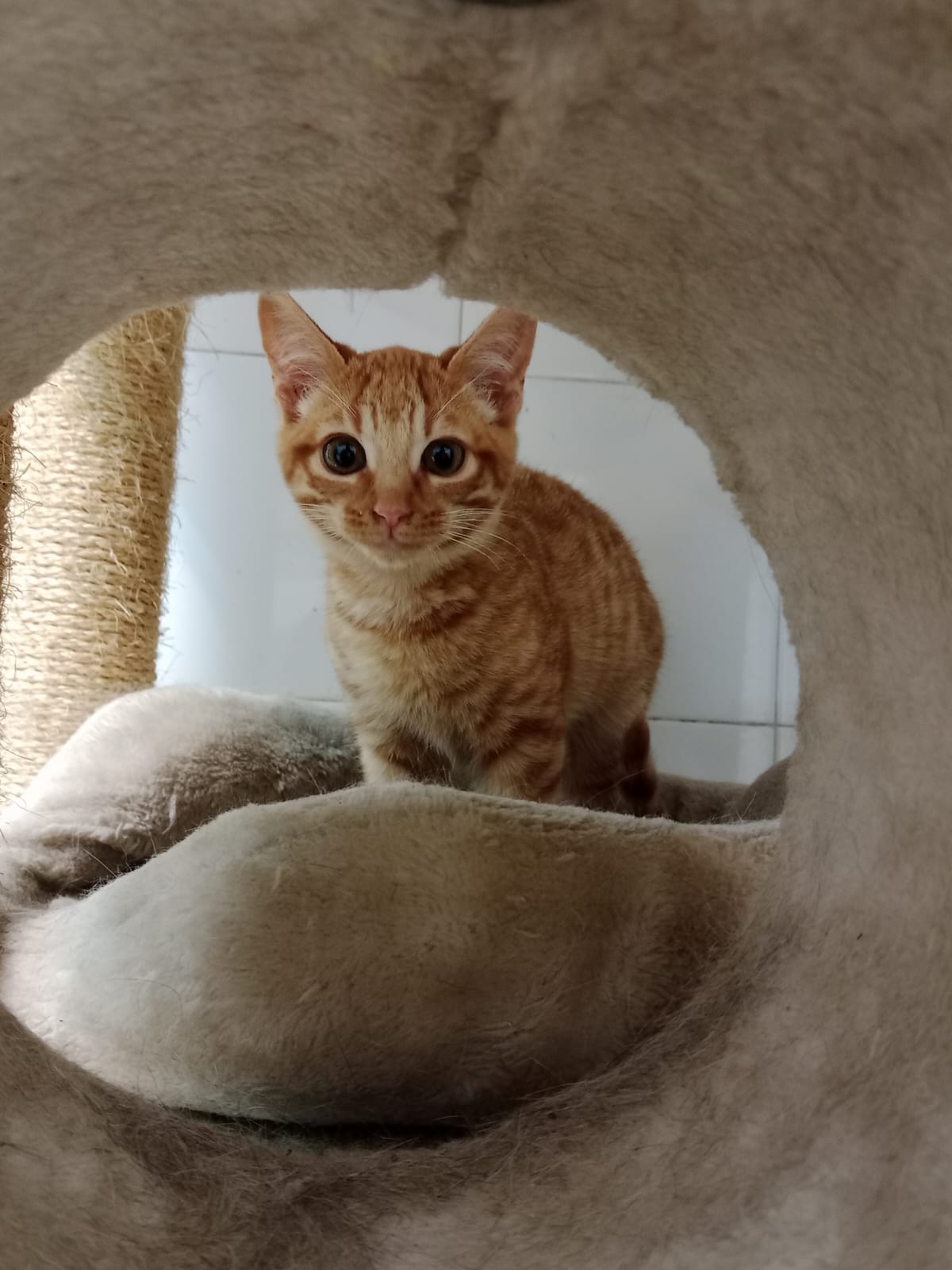 Este gatito aparecio con su hermanito Melocoton en una urbanizacion, sin rastro de la madre, corrian mucho peligro y una chica se puso en contacto con nosotros y los recogimos, son muy buenos, ya se acercan y dejan tocar.