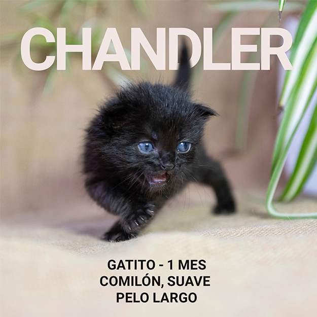 🐱 Chandler Este gatito negro de pelito largo es el grandullón de la camada 😻 Un comilón feliz, cariñoso y bonachón. Siempre es el primero en llegar al plato y después se queda tan a gusto durmiendo hecho una bolita. Le encantan los mimos y tiene un carácter encantador.