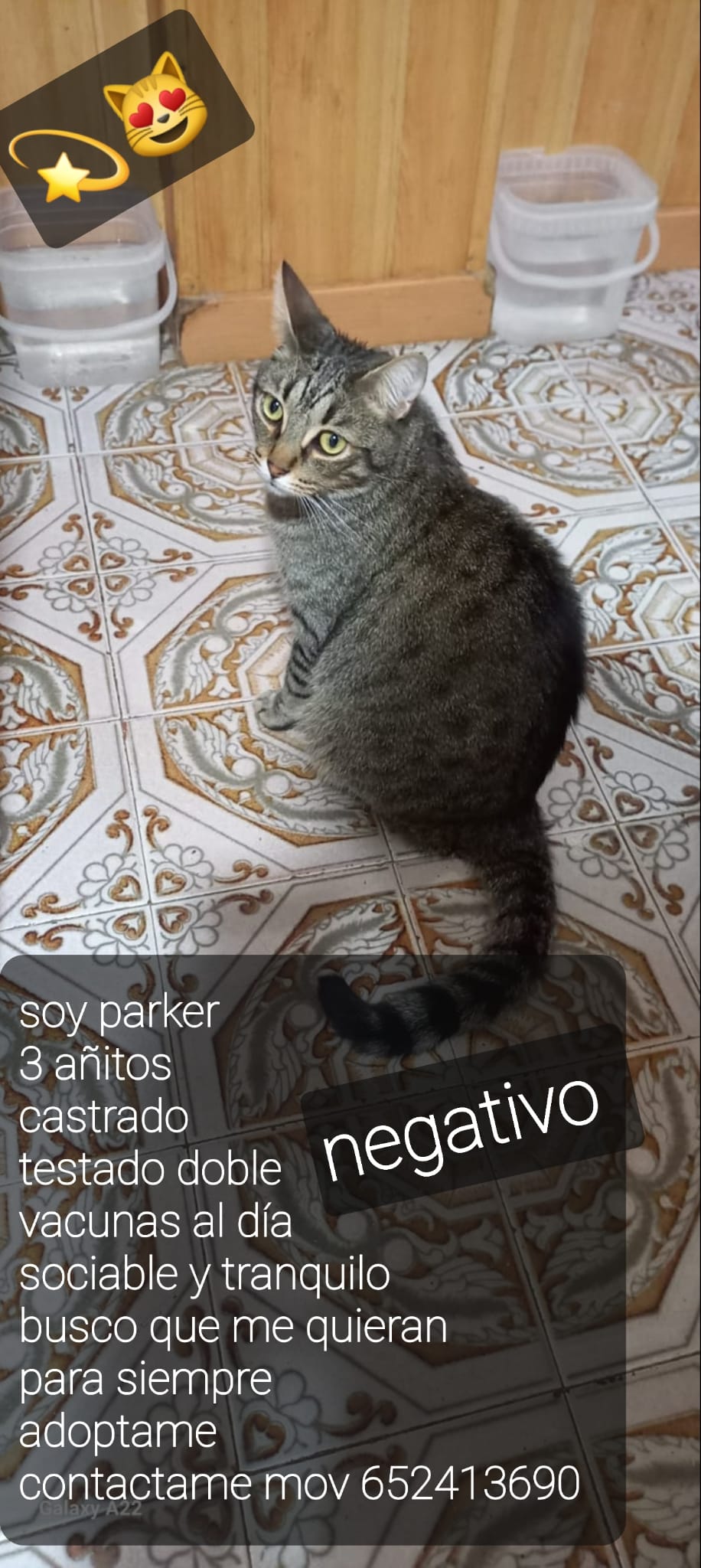 Parker es un precioso gatito de 3 añitos que solo quiere que le quieran 🥰 Está esterilizado, testado negativo, vacunado y desparasitado. Le encanta que le cojan en brazos y jueguen con el y hace unas siestas gigantes en tus piernas 🫶🏼