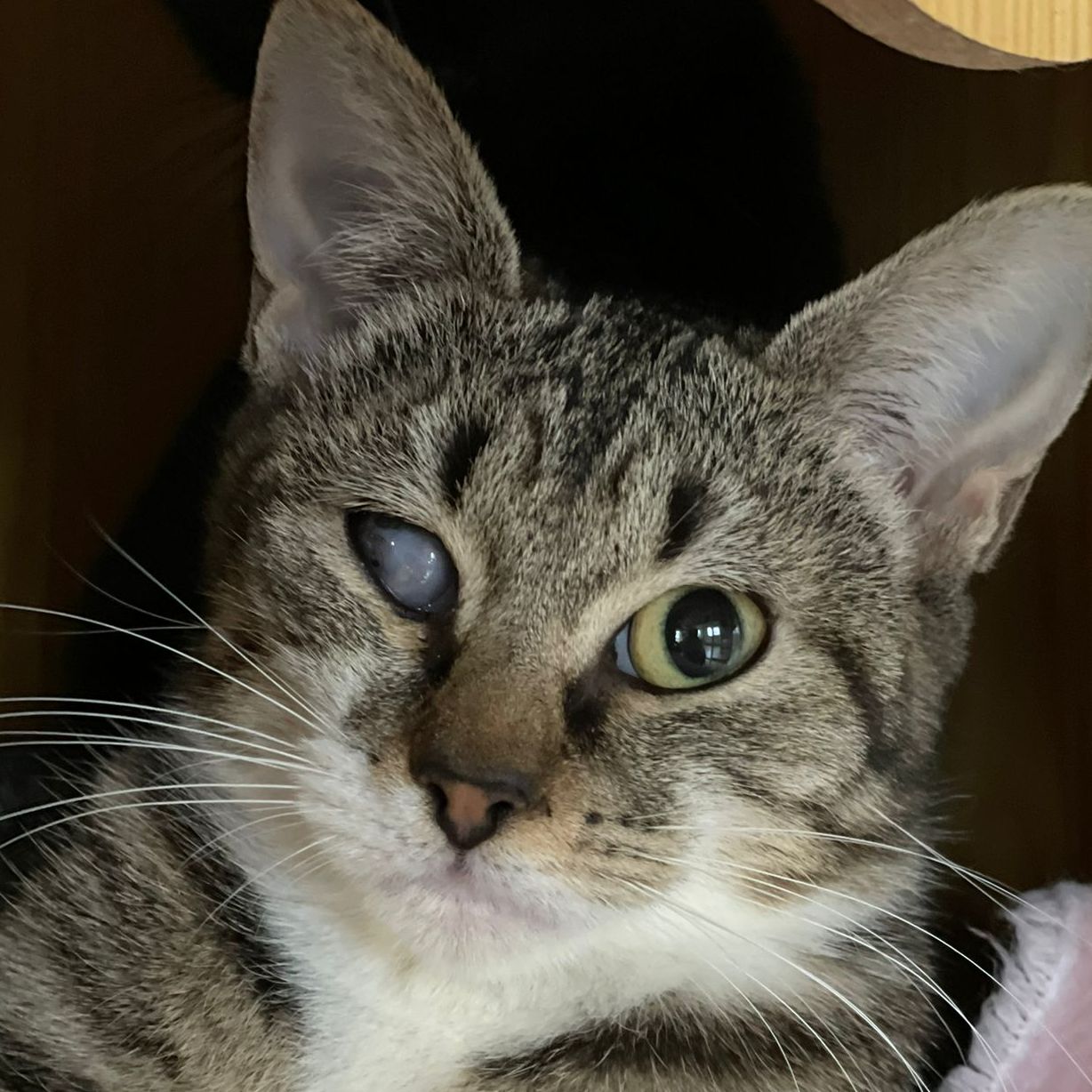 Rescatada en pésimas condiciones su ojito está perdido la visión solo por uno, hace vida muy normal en todo, juega, salta, cariñosa, todo lo normal gato cachorro