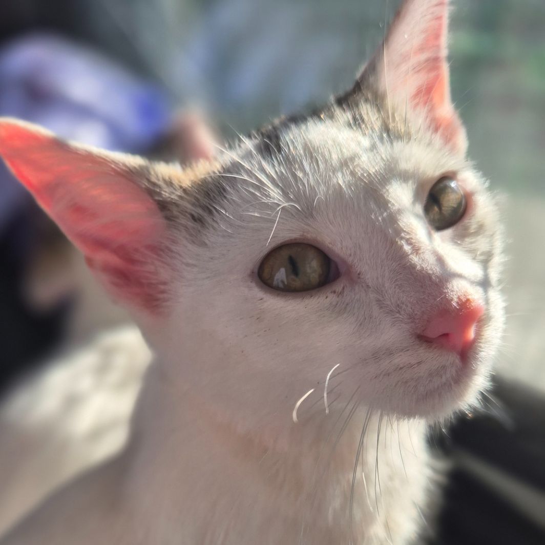 LEGOLAS es un gatito blanco con unas graciosas manchitas atigradas. Adora a su hermana Arwen.