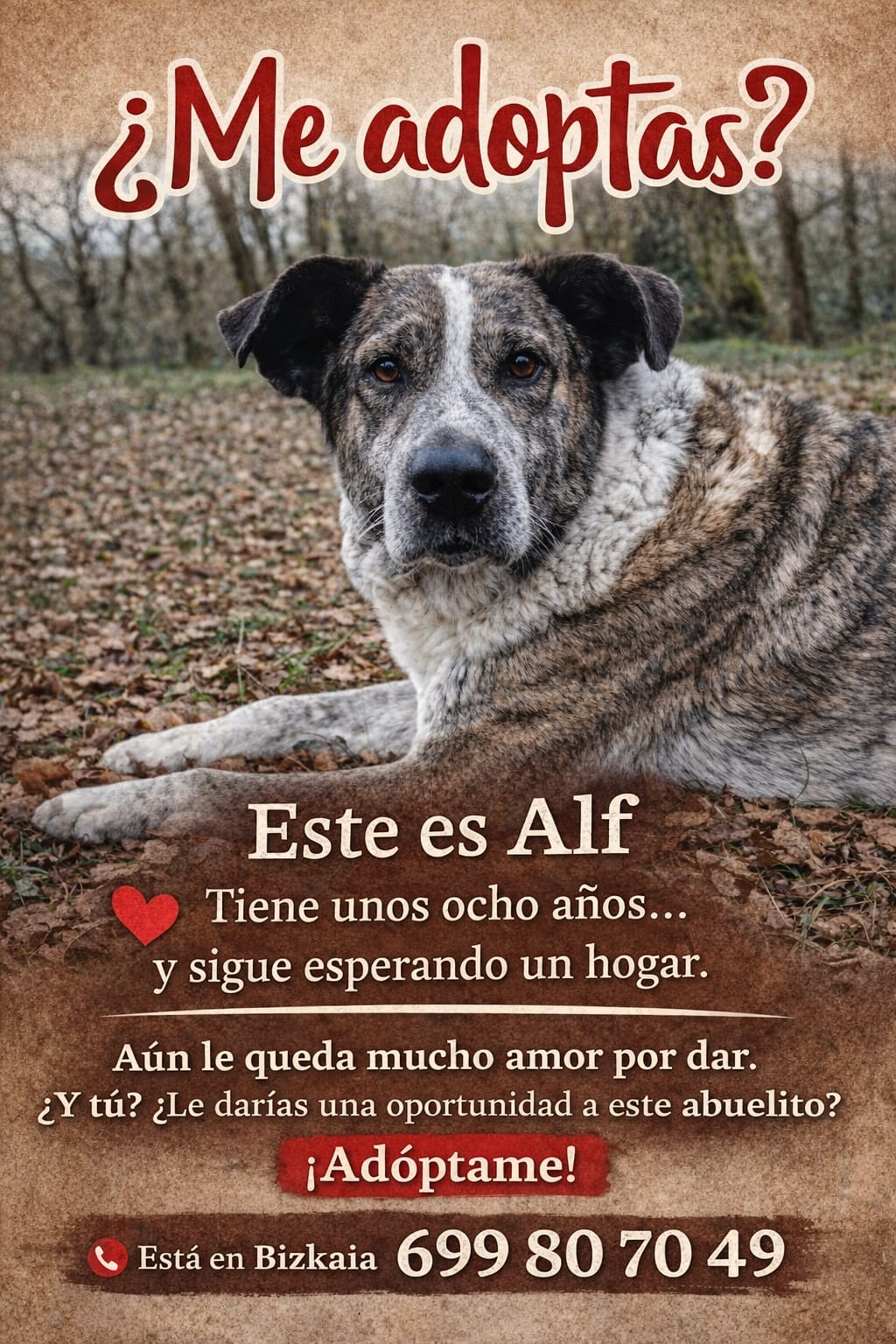 Alf vive en un chenil. No sabe cuánto tiempo lleva ahí ni cuánto más le queda. Solo sabe esperar. Cuando abrimos la puerta y le ponemos la correa, todo cambia. Sus ojos se iluminan, su cuerpo se relaja y, por un rato, deja de ser un número o un perro más. Vuelve a ser Alf. Durante el paseo hay algo que nos parte y nos calma al mismo tiempo: el silencio. No hay rejas, no hay ladridos alrededor. Solo el sonido de sus pasos, el aire, y esa paz que parece decirnos cómo debería ser su vida. Camina tranquilo, huele todo, se apoya en nosotros. Es un momento de calma, de conexión, de libertad prestada. Después llega lo inevitable. El regreso. Alf vuelve sin resistirse, con una dignidad que duele. Entra al chenil y el ruido vuelve. Los ladridos, la espera, la rutina. Y a nosotros se nos parte el corazón cada vez. Porque él se queda. Porque ese momento de paz termina, pero su encierro no. Alf no necesita mucho. Solo alguien que le regale silencio, paseos sin despedidas y una casa donde no tenga que volver atrás. 🐶💔 Ojalá algún día ese paseo sea el último regreso al chenil. Solo tu puedes hacer que su destino cambie.... Bizkaia 699 80 70 49